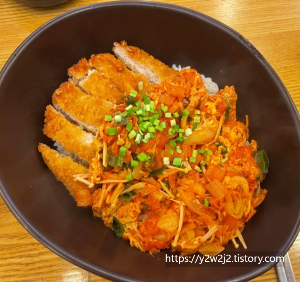 볶은 김치를 맛있는 돈가스 위에 얹은 김치가츠동
